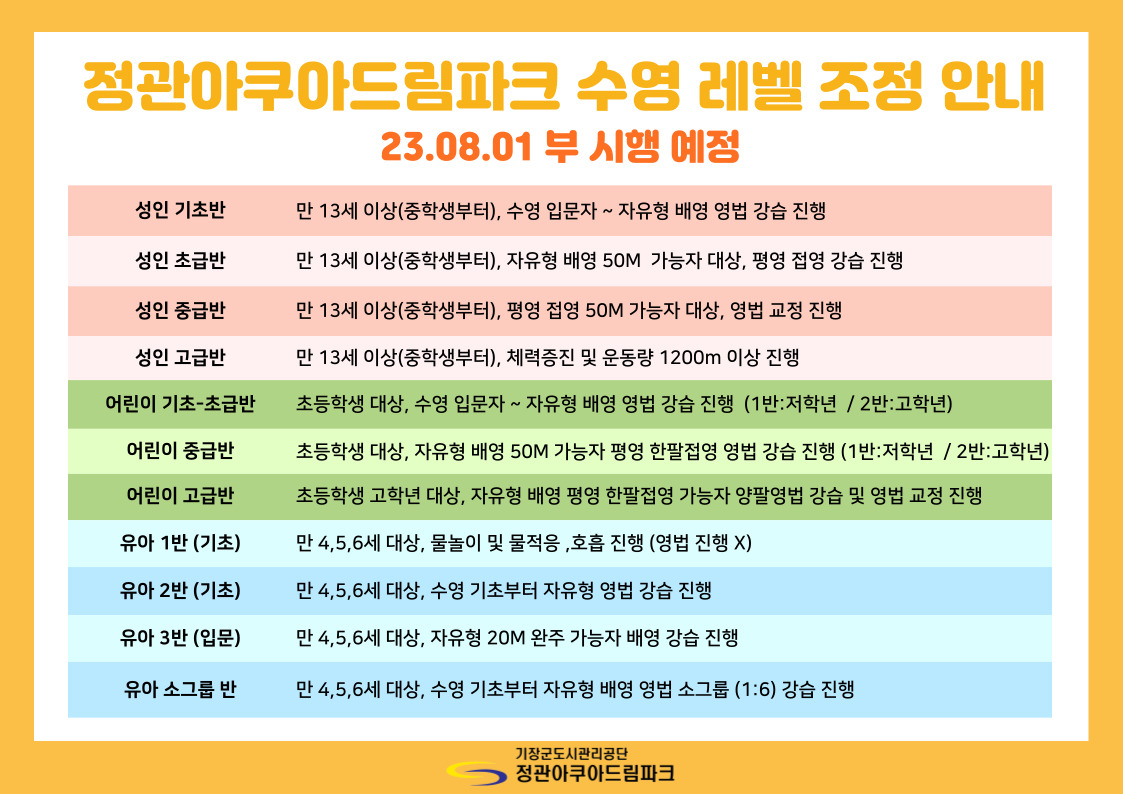 정관아쿠아드림파크 수영 레벨 조정 안내(23.08.01부 시행) 부서 - 등록일자 2023년 7월 14일 10시 46분 59초 조회 682 23.08.01부로 레벨이 변경되어 진행됩니다. 7월 기존회원은 강사님이 조정 안내 드린 대로 수정 및 등록이 되어있을 예정이니 별도의 변경 없이 그대로 재등록 하여 이용하시면 됩니다.8월 신규회원은 레벨변경안을 참고하시어 등록 부탁 드립니다. 레벨조정안내문_최종.jpg [ Size : 247.86KB , Down : 696 ] 미리보기 다운로드 목록보기