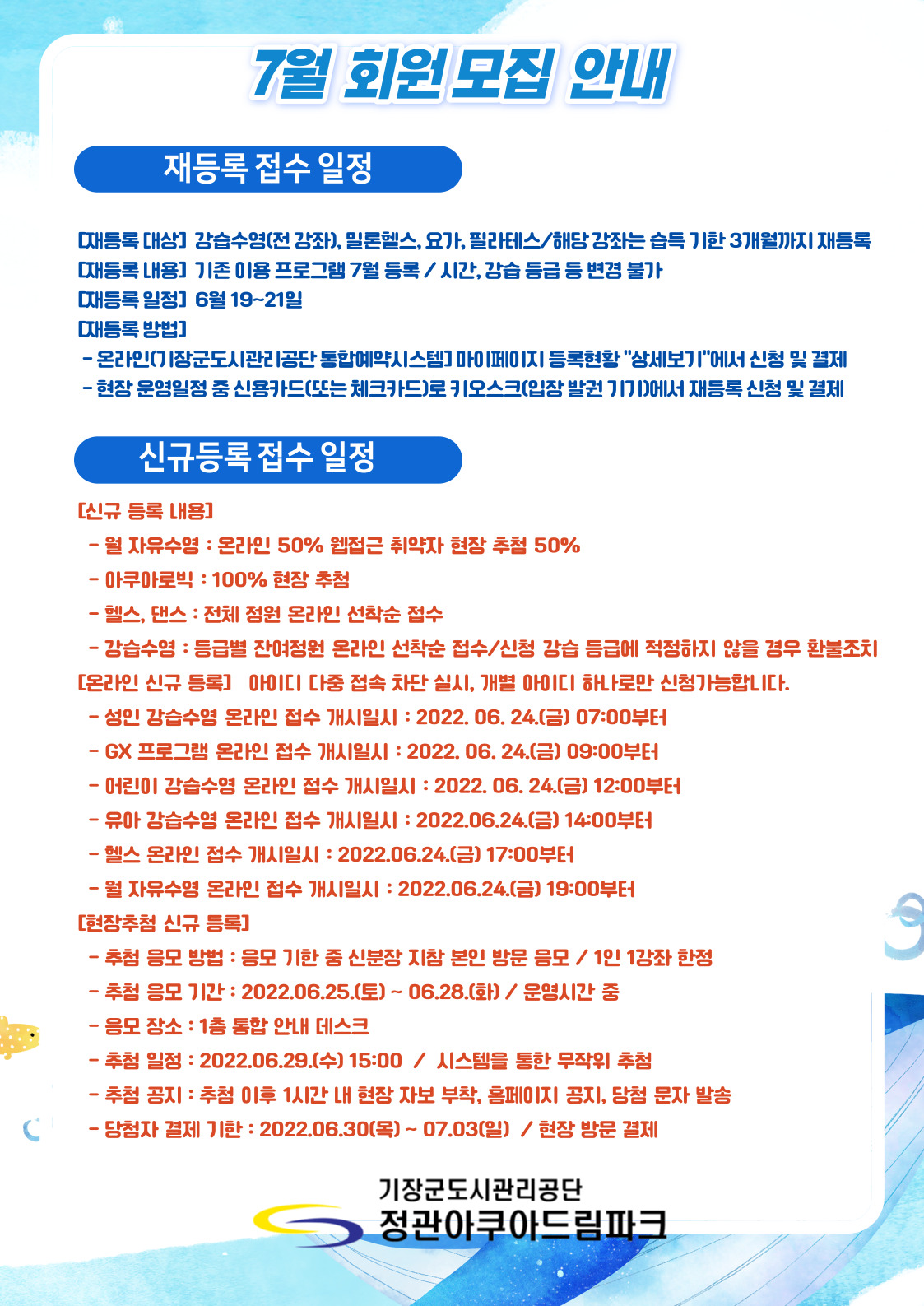 정관아쿠아드림파크 7월 정규프로그램 회원 모집 일정 안내 부서 - 등록일자 2022년 6월 17일 12시 34분 42초 조회 2,148 7월 회원 모집 일정 안내입니다. 신규접수 전 6월22일 오후 신규회원 모집 상세내역은 공지토록 하겠습니다. 7월-회원-모집-안내문-001.jpg [ Size : 572.05KB , Down : 2,649 ] 미리보기 다운로드 목록보기