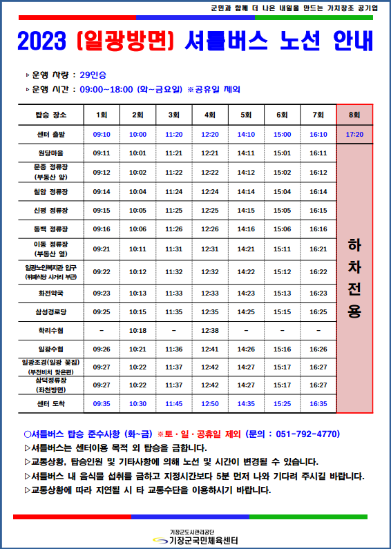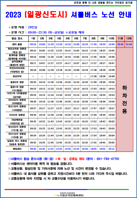운행 시간 : 09:00~18:00 (화~금요일) ※공휴일 제외 ○셔틀버스 탑승 준수사항 (화~금) ※토ㆍ일ㆍ공휴일 제외 (문의 : 051-792-4770) ▷셔틀버스는 센터이용 목적 외 탑승을 금합니다. ▷교통상황, 탑승인원 및 기타사항에 의해 노선 및 시간이 변경될 수 있습니다. ▷셔틀버스 내 음식물 섭취를 금하고 지정시간보다 5분 먼저 나와 기다려 주시길 바랍니다. ▷교통상황에 따라 지연될 시 타 교통수단을 이용하시기 바랍니다. |