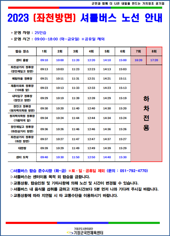 운행 차량 : 25인승 탑승 장소 | 1회 | 2회 | 3회 | 4회 | 5회 | 6회 | 7회 | 8회 | 센터 출발 | 09:10 | 10:00 | 11:20 | 12:20 | 14:10 | 15:00 | 16:20 | 17:20 | 좌천삼거리 정류장 (장안제일고 방면) | 09:13 | 10:03 | 11:23 | 12:23 | 14:13 | 15:03 | 하 차 전 용 | 예림마을 정류장 | 09:21 | 10:11 | 11:31 | 12:31 | 14:21 | 15:11 | 재흥아파트 정류장 (106동 앞) | 09:23 | 10:13 | 11:33 | 12:33 | 14:23 | 15:13 | 내덕입구 정류장 (장안고 방면) | 09:29 | 10:19 | 11:39 | 12:39 | 14:29 | 15:19 | 장안고 정류장 (원자력의학원 방면) | 09:30 | 10:20 | 11:40 | 12:40 | 14:30 | 15:20 | 원자력의학원 정류장 (가람약국 앞) | 09:34 | 10:24 | 11:44 | 12:44 | 14:34 | 15:24 | 장안제일고 정류장 (좌천삼거리 방면) | 09:36 | 10:26 | 11:46 | 12:46 | 14:36 | 15:26 | 좌천삼거리 정류장 (좌천 방면) | 09:37 | 10:27 | 11:47 | 12:47 | 14:37 | 15:27 | 대한탕 | 09:39 | 10:29 | 11:49 | 12:49 | 14:39 | 15:29 | 센터 도착 | 09:40 | 10:30 | 11:50 | 12:50 | 14:40 | 15:30 |