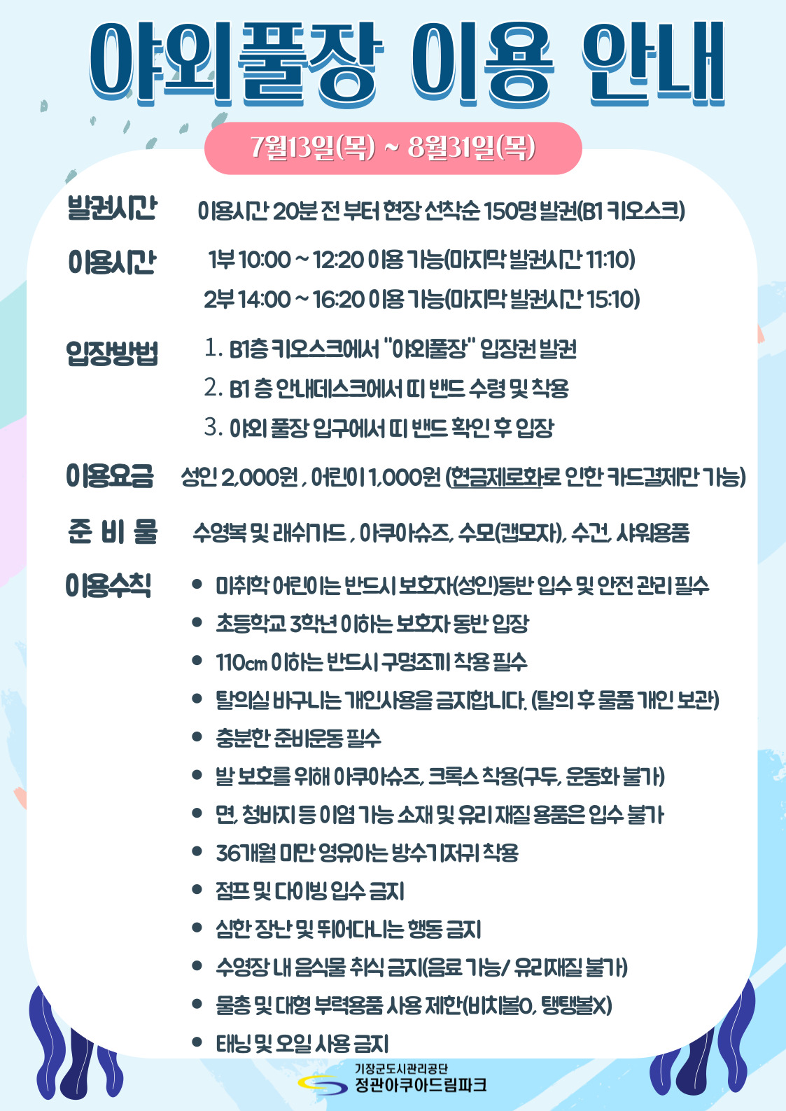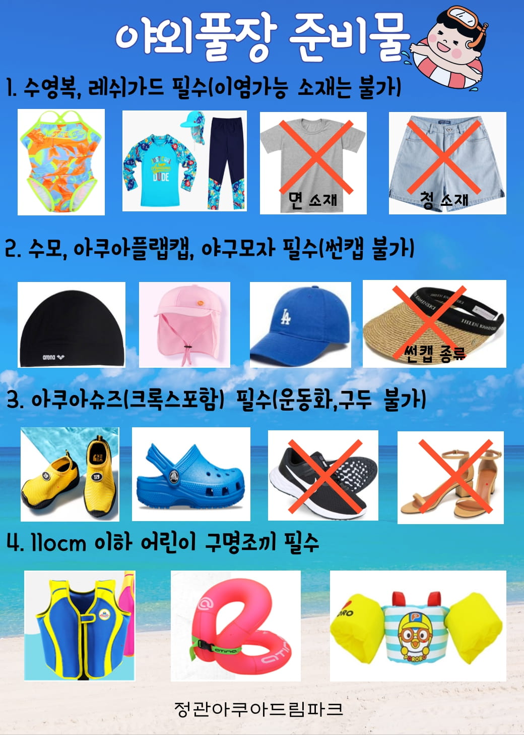 정관아쿠아드림파크 야외 물놀이장 이용 수칙 안내 부서 - 등록일자 2023년 7월 29일 5시 18분 37초 조회 702 야외물놀이장.jpg [ Size : 429.04KB , Down : 191 ] 미리보기 다운로드 야외물놀이장 준비물(1).jpg [ Size : 234.62KB , Down : 1,185 ] 미리보기 다운로드 목록보기