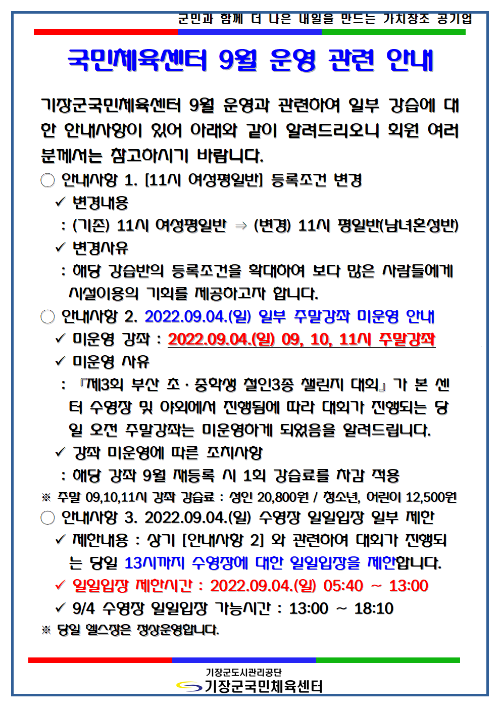 기장군국민체육센터 9월 운영과 관련하여 일부 강습에 대한 안내사항이 있어 아래와 같이 알려드리오니 회원 여러분께서는 참고하시기 바랍니다.