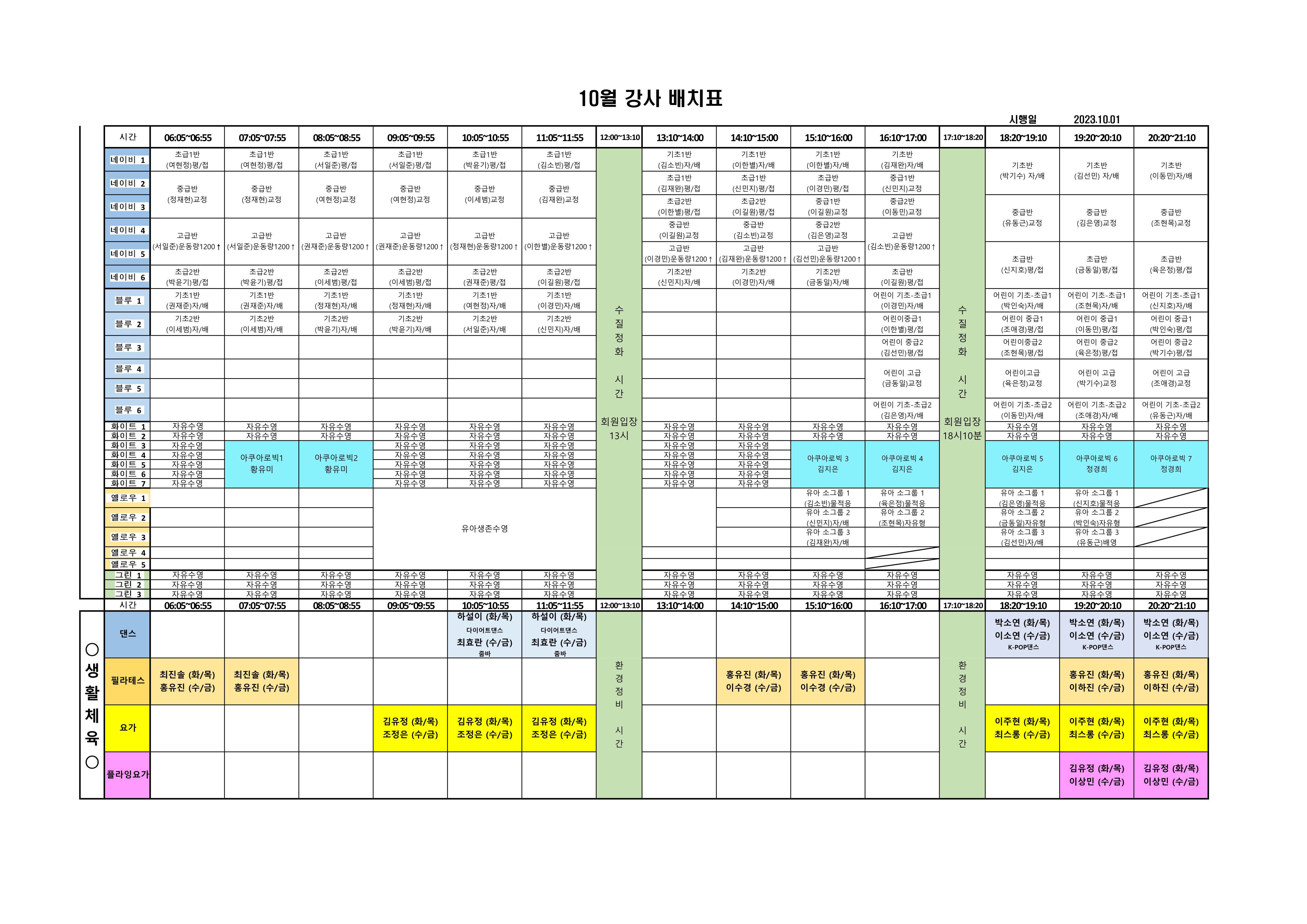정관아쿠아드림파크 10월 강사 배치 안내 부서 - 등록일자 2023년 9월 23일 10시 53분 59초 조회 714 10월 강습 강사 배치표 입니다.참고하시어 수강신청 부탁드립니다.감사합니다. 10월 강사 배치표.jpg [ Size : 1.82MB , Down : 519 ] 미리보기 다운로드 목록보기