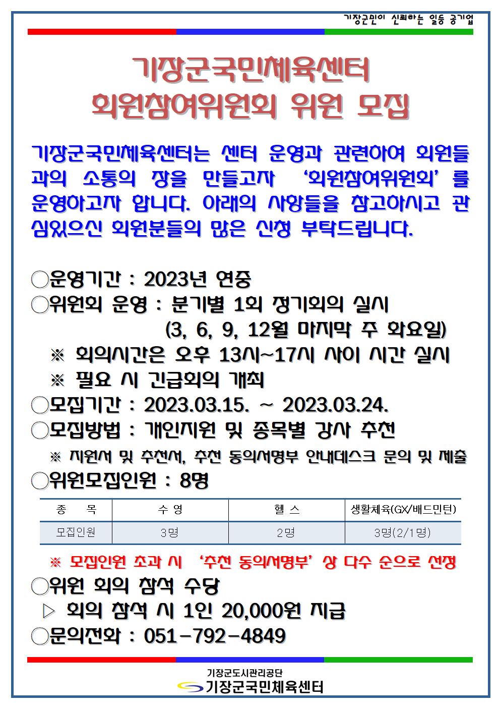 기장군국민체육센터 [회원참여위원회] 위원 모집 부서 - 등록일자 2023년 3월 17일 15시 58분 51초 조회 5,923 회원참여위원회 모집 공고001.jpg [ Size : 234.38KB , Down : 7,832 ] 미리보기 다운로드 목록보기