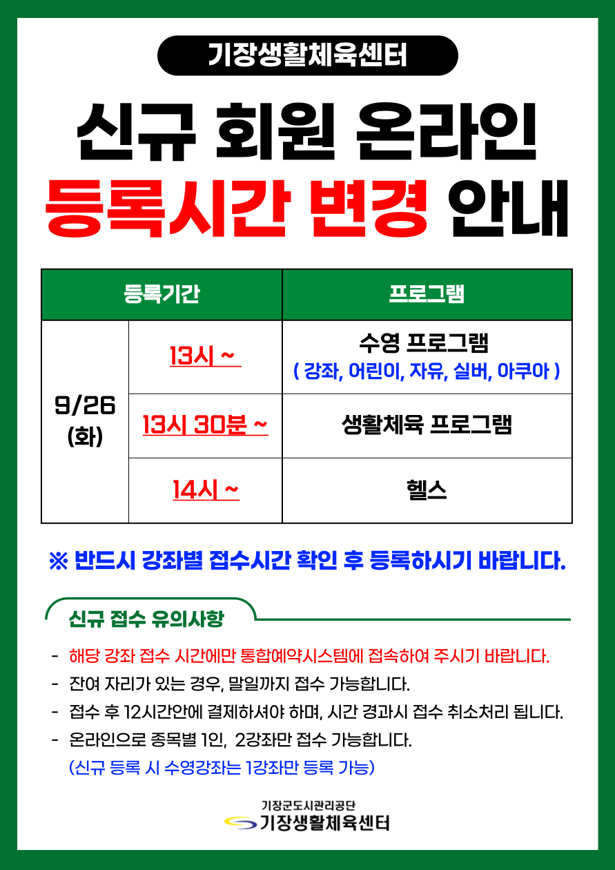 기장생활체육센터 신규회원 온라인 등록시간 변경 안내 부서 - 등록일자 2023년 9월 1일 20시 28분 34초 조회 552 ※ 원활한 온라인 신규 접수를 위하여 지속적인 모니터링을 통해 신규 접수 시간을 변경하오니 양해부탁드립니다. 9월 신규등록 변경(홈페이지용).png [ Size : 139.54KB , Down : 123 ] 미리보기 다운로드 목록보기