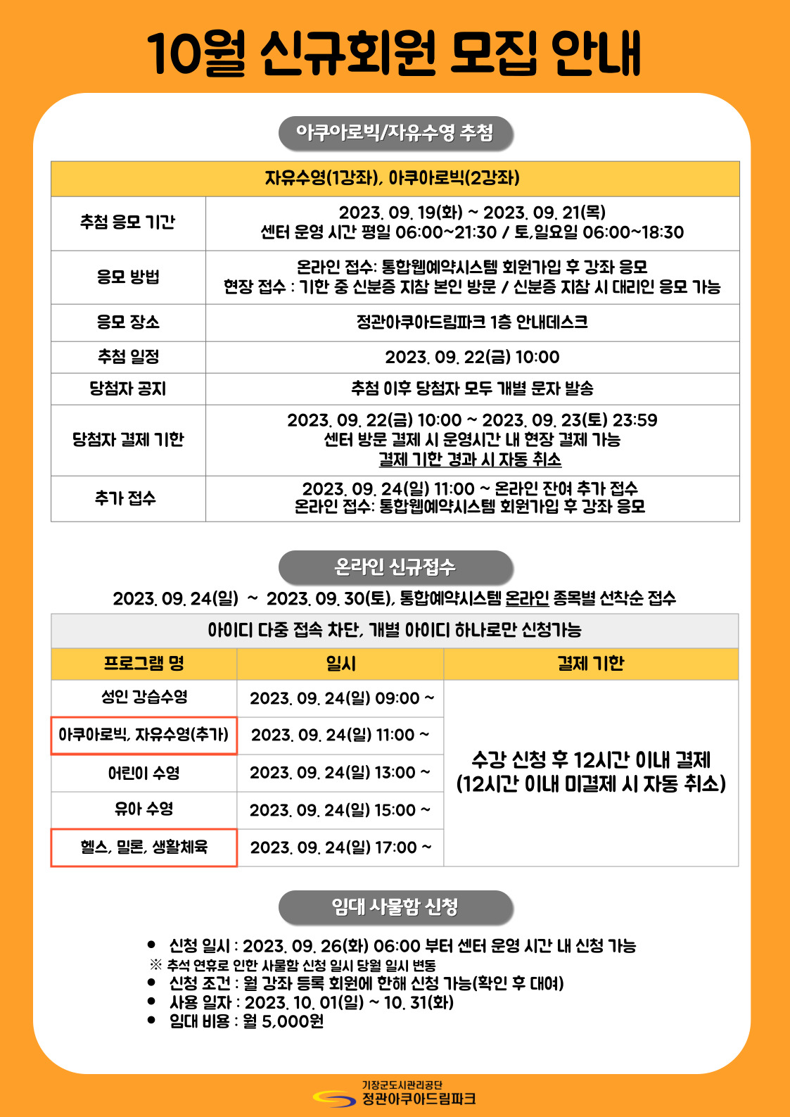 정관아쿠아드림파크 10월 신규 회원 모집 안내