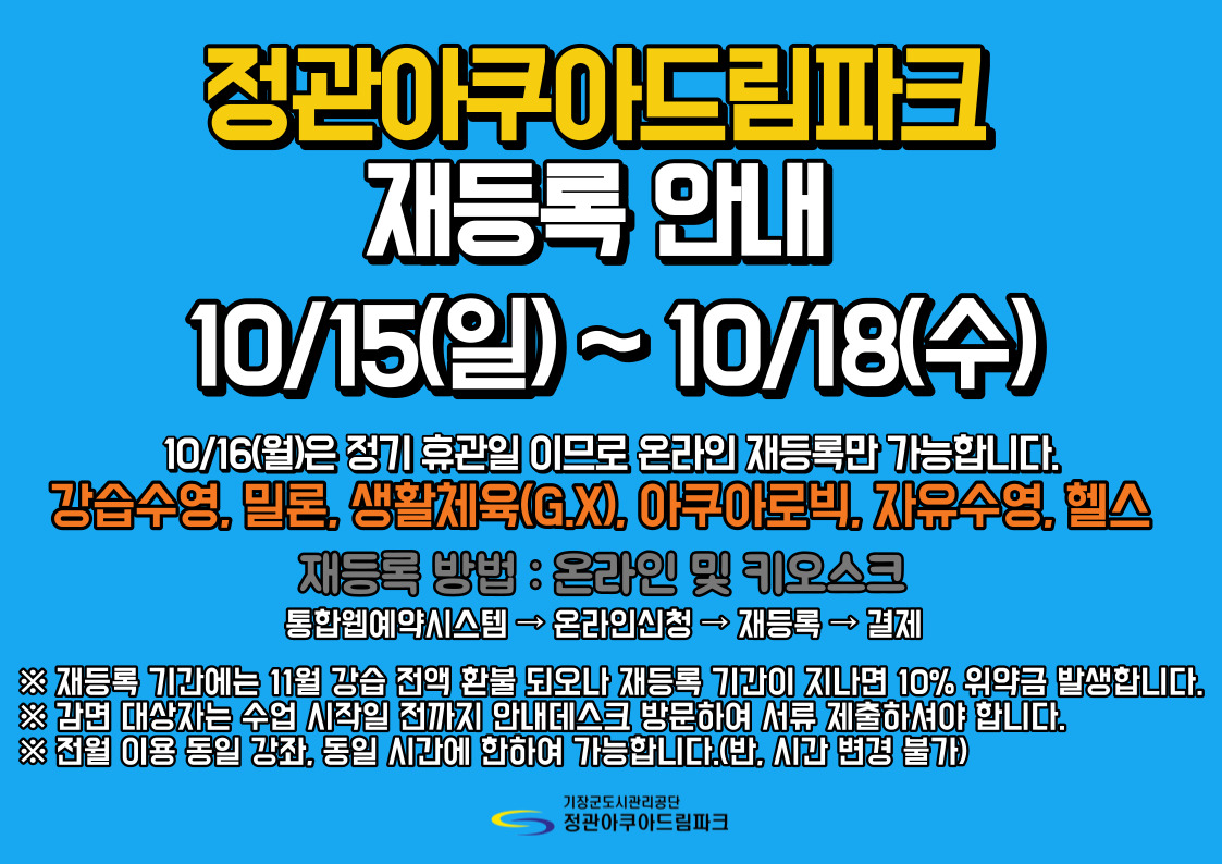 정관아쿠아드림파크 11월 강습 재등록 안내 부서 - 등록일자 2023년 10월 9일 20시 40분 39초 조회 591 10월 16일(월)은 정관아쿠아드림파크 정기 휴관일 이므로 온라인 재등록만 가능합니다. 감사합니다. 10월 재등록.jpg [ Size : 331.97KB , Down : 170 ] 미리보기 다운로드 목록보기