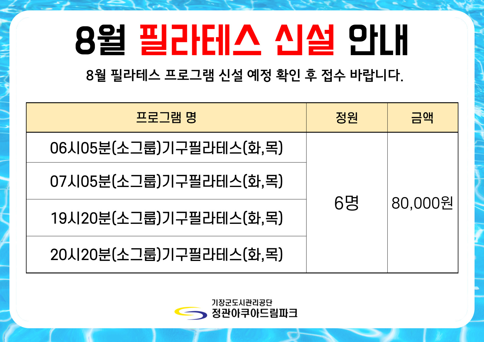 정관아쿠아드림파크 8월 필라테스 추가 개설 안내 부서 - 등록일자 2023년 7월 18일 18시 20분 51초 조회 518 8월 필라테스 신설.jpg [ Size : 273.77KB , Down : 447 ] 미리보기 다운로드 목록보기