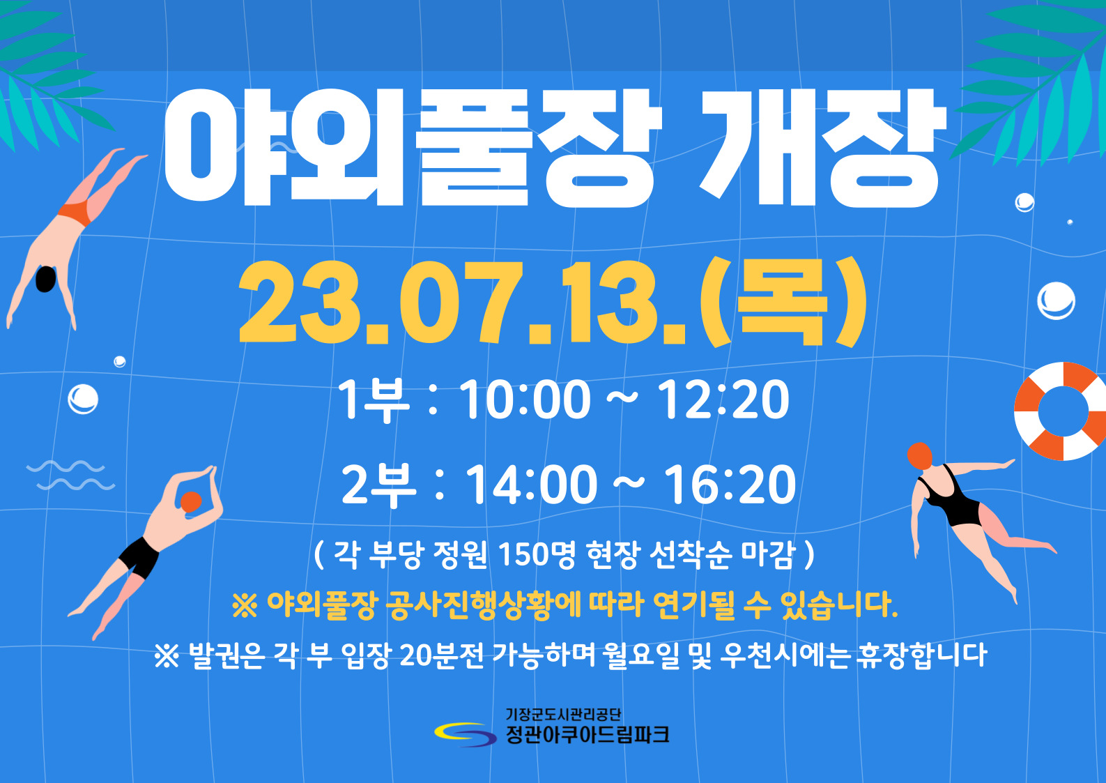 정관아쿠아드림파크 야외풀장 개장 안내 부서 - 등록일자 2023년 6월 29일 8시 17분 24초 조회 511 운영기간 : 23.07.13.(목) ~ 08.31.(목) 이용대상 : 누구나 이용 가능. 단, 만 8세 이하 유아 및 110cm이하 어린이 구명 조끼 필수 착용, 반드시 보호자와 동반 입장해야 함.이용요금 : 성인 2,000원 / 청소년·어린이 1,000원문의전화 : 051-792-4900 야외풀장 개장 안내.jpg [ Size : 390.96KB , Down : 173 ] 미리보기 다운로드 목록보기