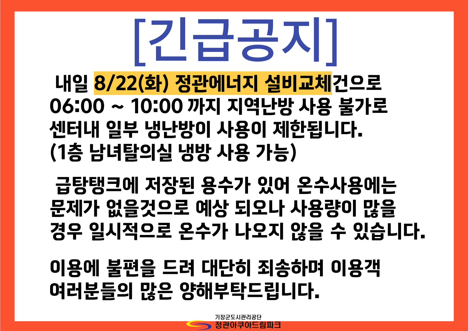 [긴급공지] 8/22(화) 정관에너지 설비교체건으로 인한 지역난방 사용 불가 시간 안내 부서 - 등록일자 2023년 8월 21일 15시 25분 52초 조회 422 설비교체공지안내문_0822.jpg [ Size : 304.22KB , Down : 263 ] 미리보기 다운로드 목록보기