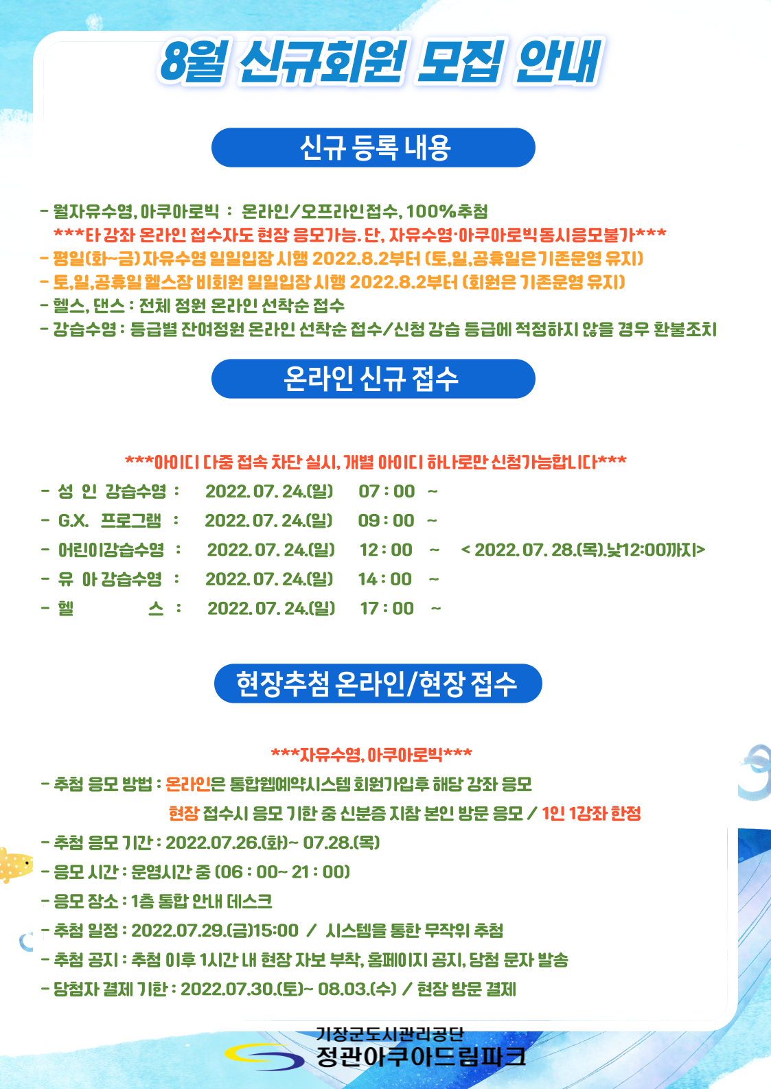 정관아쿠아드림파크 8월 신규회원 모집 안내(반별 잔여 정원 공지) 부서 - 등록일자 2022년 7월 22일 21시 0분 58초 조회 2,829 공단홈페이지 공지사항(http://www.gijangcmc.or.kr/impartment/impartment01.asp?id=Notice&idx=2503&mode=view) 첨부문서의 상세 내용을 꼭 확인하시고 신청바랍니다. 8월 회원 모집 안내문.png [ Size : 575.86KB , Down : 3,530 ] 미리보기 다운로드 목록보기