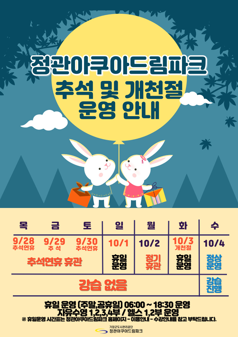 정관아쿠아드림파크 추석, 개천절 연휴 운영 안내 부서 - 등록일자 2023년 9월 16일 15시 29분 53초 조회 753 추석 및 개천절 연휴 운영 안내문 입니다. 휴일 운영(주말,공휴일) 시간표 바로 가기 → 정관아쿠아드림파크 홈페이지에 오신 것을 환영합니다 (gijangcmc.or.kr) 아쿠아드림파크 추석 개천절 운영안내.jpg [ Size : 243.04KB , Down : 139 ] 미리보기 다운로드 목록보기