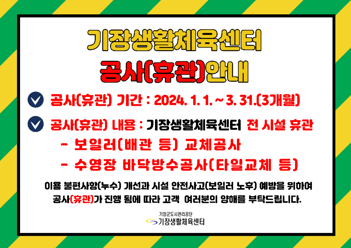 기장생활체육센터 2024년 공사(휴관) 안내 부서 - 등록일자 2023년 10월 12일 15시 39분 33초 조회 608 공사안내(1012)가로-002.jpg [ Size : 465.61KB , Down : 634 ] 미리보기 다운로드 목록보기