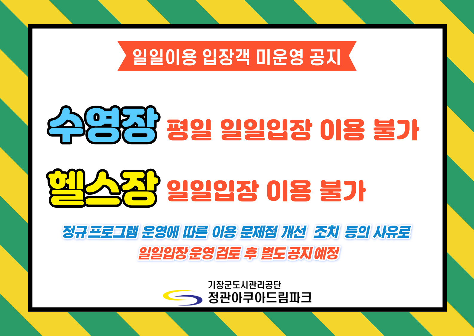 정관아쿠아드림파크 일일입장 미운영 공지 부서 - 등록일자 2022년 6월 17일 12시 34분 0초 조회 933 정관아쿠아드림파크 정규 프로그램 개강에 따른 실내수영장과 헬스장의 일일이용객 입장 미운영 공지입니다. 신속한 이용문제점 개선, 강습반 별 이용현황에 따른 잔여 라커룸 통계, 시설 입장 여유 인원 검토 등을 거쳐 별도 일일입장 운영 공지를 하도록 하겠습니다. 일일이용-객-미운영-001.jpg [ Size : 333.49KB , Down : 472 ] 미리보기 다운로드 목록보기
