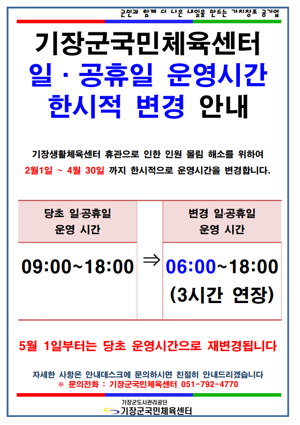 기장군국민체육센터 일 공휴일 운영시간 한시적 변경 안내 부서 - 등록일자 2024년 1월 19일 19시 10분 18초 조회 316 기장군국민체육센터 일 공휴일 운영시간 한시적 변경 안내.png [ Size : 93.63KB , Down : 267 ] 미리보기 다운로드 목록보기