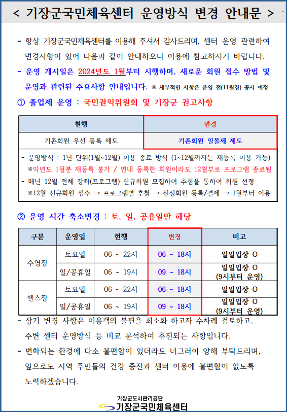 기장군국민체육센터 운영방식 변경 안내 부서 - 등록일자 2023년 3월 20일 11시 4분 30초 조회 737 운영방식 변경 안내.png [ Size : 155.81KB , Down : 664 ] 미리보기 다운로드 목록보기