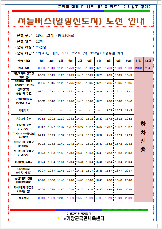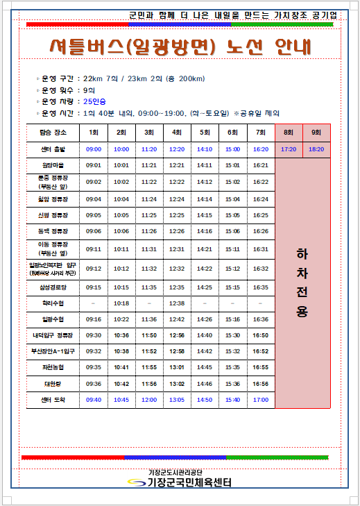 기장군국민체육센터 6월 셔틀버스 노선도 부서 - 등록일자 2022년 5월 27일 11시 27분 47초 조회 945 기장군국민체육센터 6월 셔틀버스 노선도 6월 셔틀노선 일광신도시.png [ Size : 73.8KB , Down : 410 ] 미리보기 다운로드 6월 셔틀노선 일광.png [ Size : 60.81KB , Down : 306 ] 미리보기 다운로드 목록보기