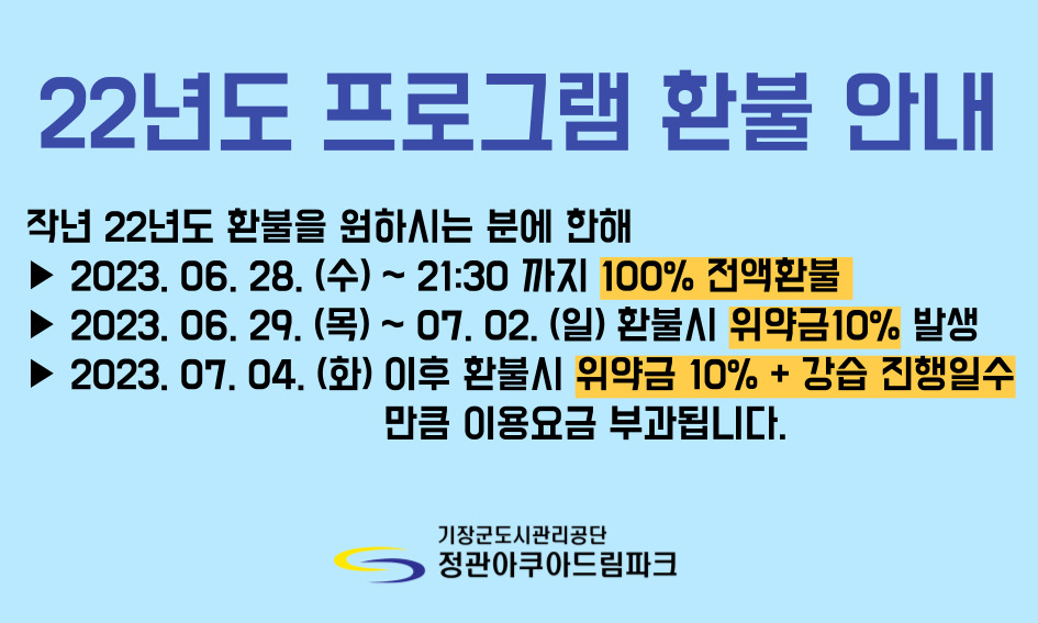 정관아쿠아드림파크 2022년도 프로그램 환불 안내 부서 - 등록일자 2023년 6월 21일 15시 3분 34초 조회 614 환불안내문.jpg [ Size : 135.95KB , Down : 151 ] 미리보기 다운로드 목록보기