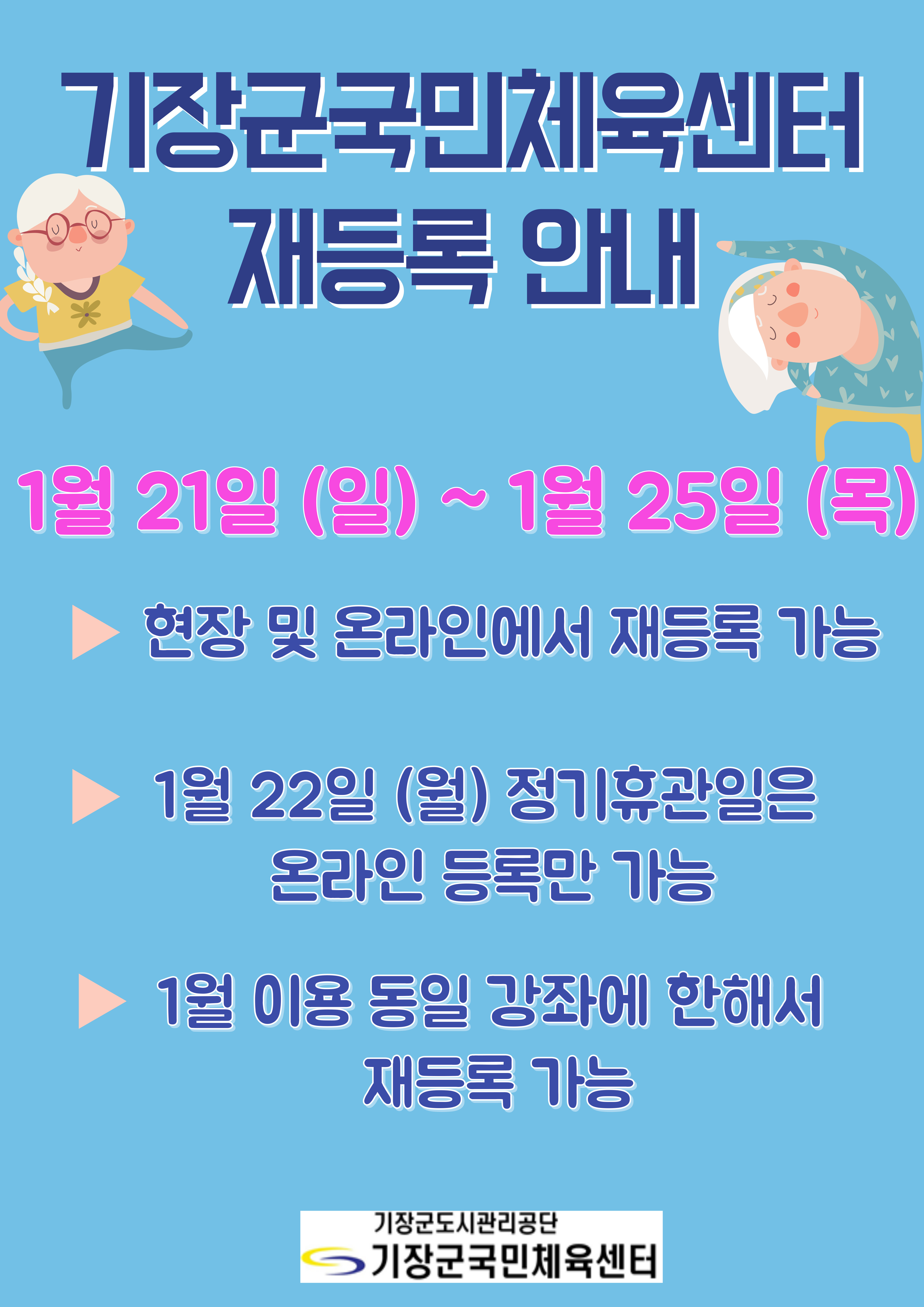 기장군국민체육센터 2월 재등록 기간 안내 부서 - 등록일자 2024년 1월 22일 9시 46분 8초 조회 682 1월재등록안내(국민).jpg [ Size : 2.02MB , Down : 795 ] 미리보기 다운로드 목록보기
