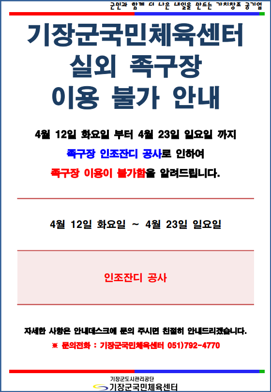 기장군국민체육센터 실외 족구장 이용 불가 안내 부서 - 등록일자 2023년 4월 13일 10시 43분 26초 조회 419 실외족구장 이용불가안내.png [ Size : 77.14KB , Down : 333 ] 미리보기 다운로드 목록보기