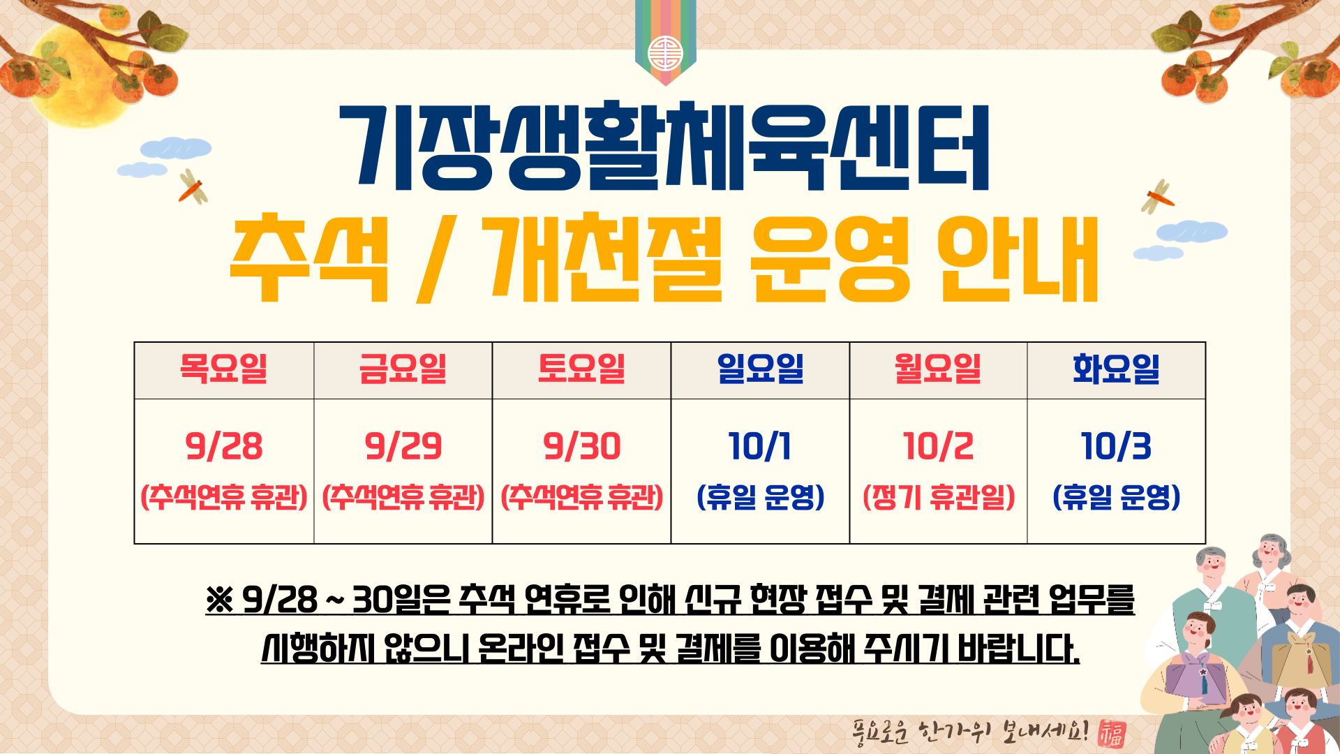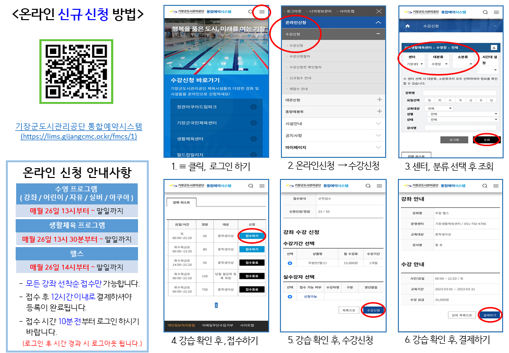 기장생활체육센터 추석 연휴 및 개천절 운영 안내 부서 - 등록일자 2023년 9월 20일 19시 20분 55초 조회 638 ※ 온라인 접수 방법을 모르시는 경우, 아래 온라인 신규 신청 방법 안내문을 참고하여 접수하여 주시기 바랍니다. 첨부 파일을 다운 받으시면 선명한 안내문을 확인하실 수 있습니다. 연휴 안내.png [ Size : 478.84KB , Down : 190 ] 미리보기 다운로드 온라인 신규신청방법.png [ Size : 291.58KB , Down : 161 ] 미리보기 다운로드 목록보기