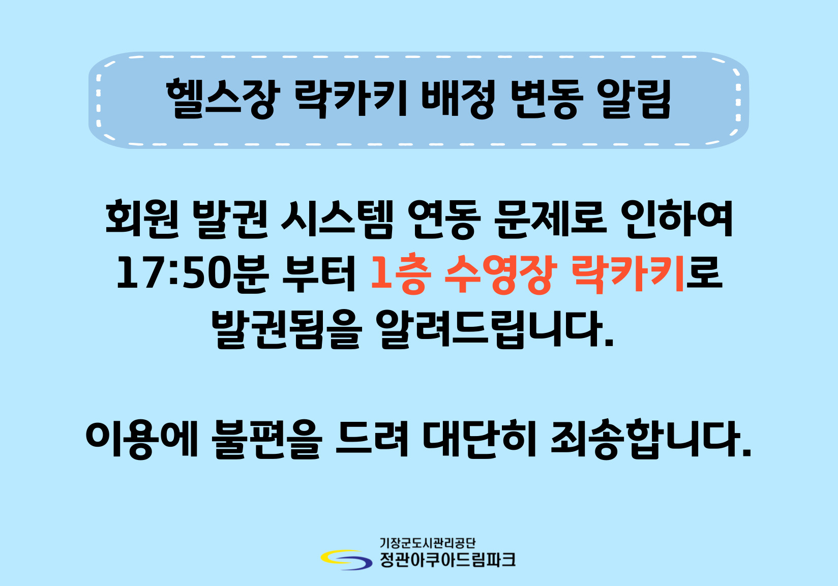 정관아쿠아드림파크 헬스장 락카키 배정 변동 알림 부서 - 등록일자 2023년 7월 7일 17시 32분 49초 조회 322 헬스장 락카키 배정 변동 알림.jpg [ Size : 237.79KB , Down : 113 ] 미리보기 다운로드 목록보기