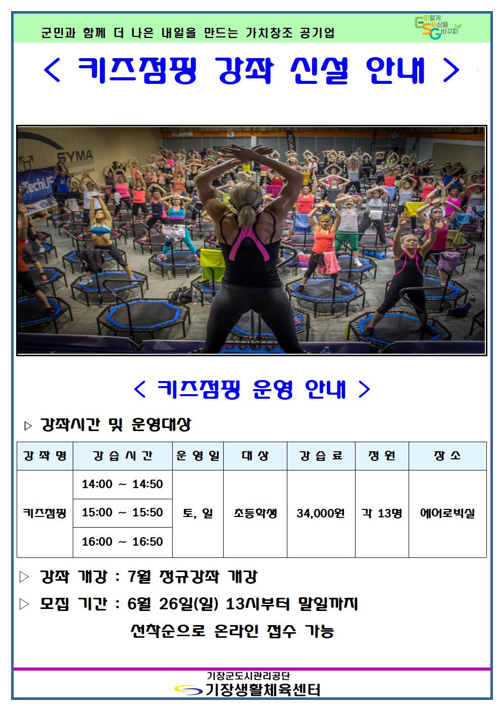 기장생활체육센터 키즈점핑 강좌 신설 안내 부서 - 등록일자 2022년 6월 24일 18시 19분 40초 조회 739 7월부터 기장생활체육센터에서 키즈점핑 강좌가 신설될 예정이오니 첨부 파일 확인 후 이용에 참고하시기 바랍니다. 키즈점핑 안내문001.jpg [ Size : 205.73KB , Down : 369 ] 미리보기 다운로드 목록보기