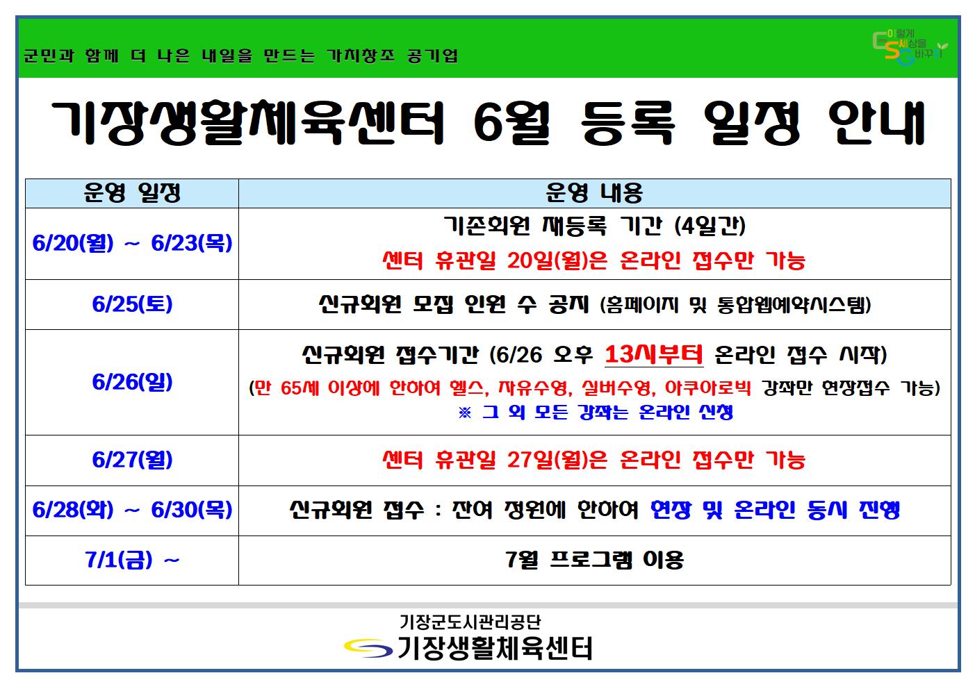 기장생활체육센터 6월 회원 모집 일정 안내 부서 - 등록일자 2022년 6월 18일 15시 52분 16초 조회 1,260 기장생활체육센터 6월 회원 모집 일정 안내입니다. 첨부파일 확인 후 이용에 참고하시기 바랍니다. 센터 6월 등록 일정 안내001.jpg [ Size : 195.78KB , Down : 887 ] 미리보기 다운로드 목록보기