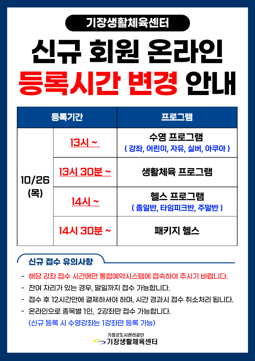 기장생활체육센터 10월 신규 회원 온라인 등록시간 변경 안내 부서 - 등록일자 2023년 10월 3일 13시 14분 54초 조회 453 10월 신규 접수 시간.png [ Size : 137.29KB , Down : 177 ] 미리보기 다운로드 목록보기