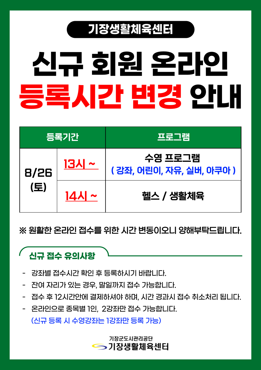 기장생활체육센터 신규회원 온라인 등록시간 변경 안내 부서 - 등록일자 2023년 8월 1일 16시 54분 51초 조회 661 신규 변경 (온라인).png [ Size : 142.49KB , Down : 124 ] 미리보기 다운로드 목록보기