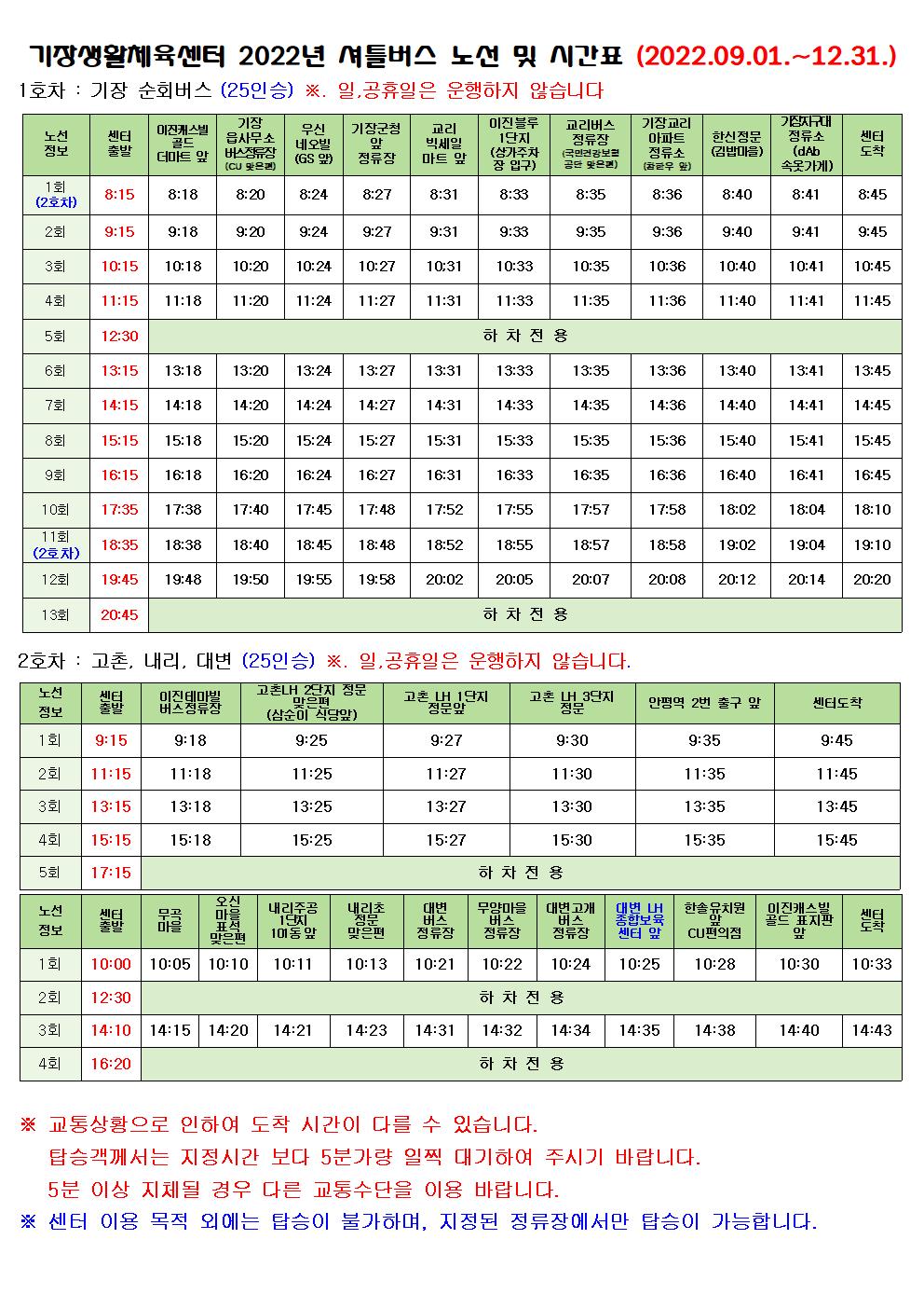 2022년 기장생활체육센터 셔틀버스 노선 변경 안내