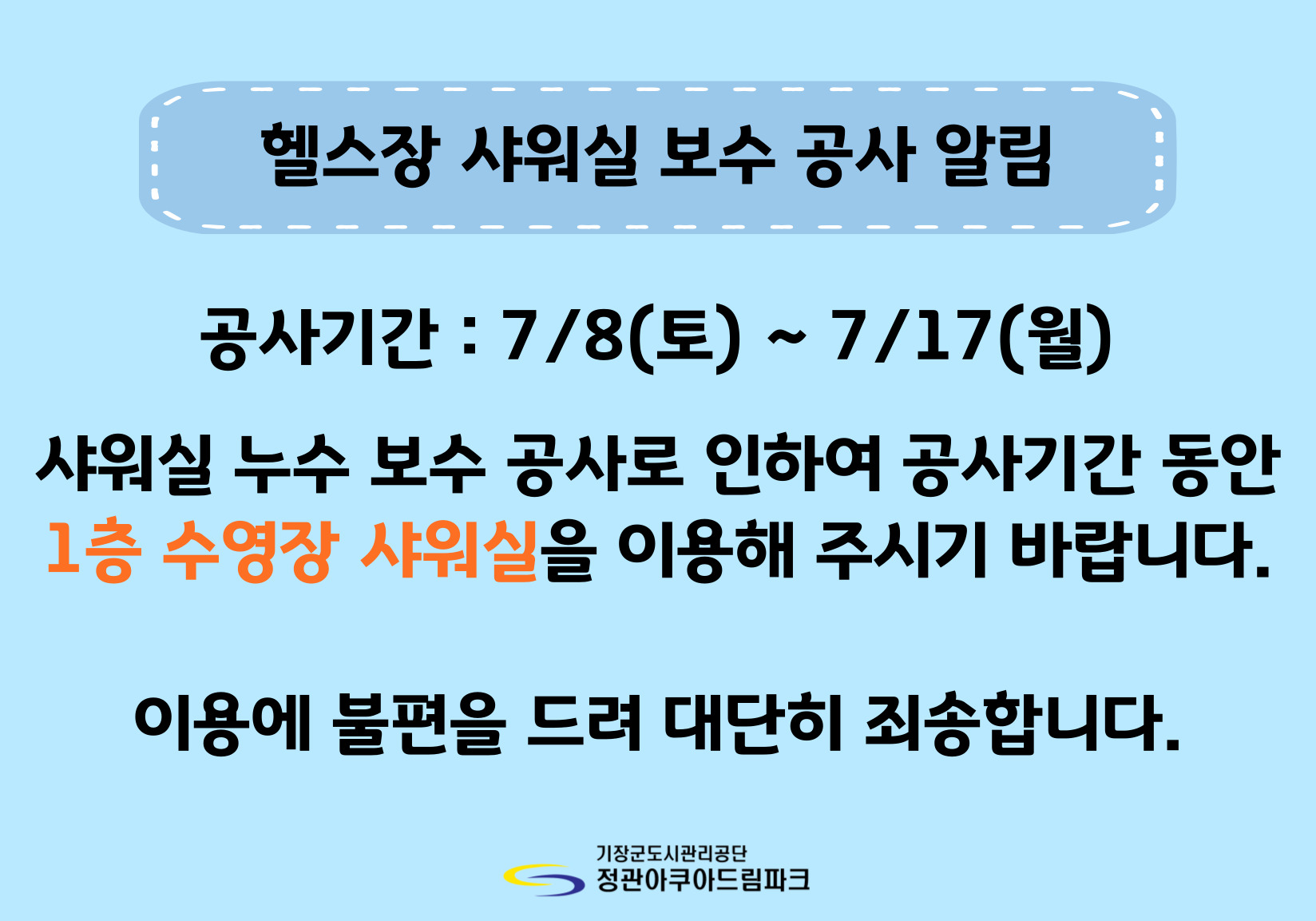정관아쿠아드림파크 샤워실 보수 공사 알림 부서 - 등록일자 2023년 7월 4일 17시 20분 17초 조회 461 헬스장 보수공사.jpg [ Size : 267.29KB , Down : 108 ] 미리보기 다운로드 목록보기