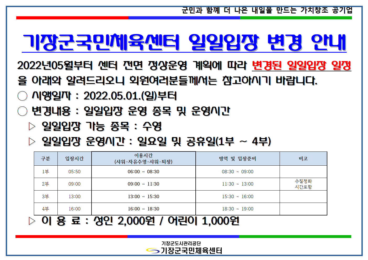 기장군국민체육센터 일일입장 시간 안내 2022년05월부터 센터 전면 정상운영 계획에 따라 변경된 일일입장 일정을 아래와 알려드리오니 회원여러분들께서는 참고하시기 바랍니다. ○ 시행일자 : 2022.05.01.(일)부터 ○ 변경내용 : 일일입장 운영 종목 및 운영시간 ▷ 일일입장 가능 종목 : 수영 ▷ 일일입장 운영시간 : 일요일 및 공휴일(1부 ~ 4부) ※각 부별 시간표 첨부파일 참조 ▷ 이 용 료 : 성인 2,000원 / 어린이 1,000원