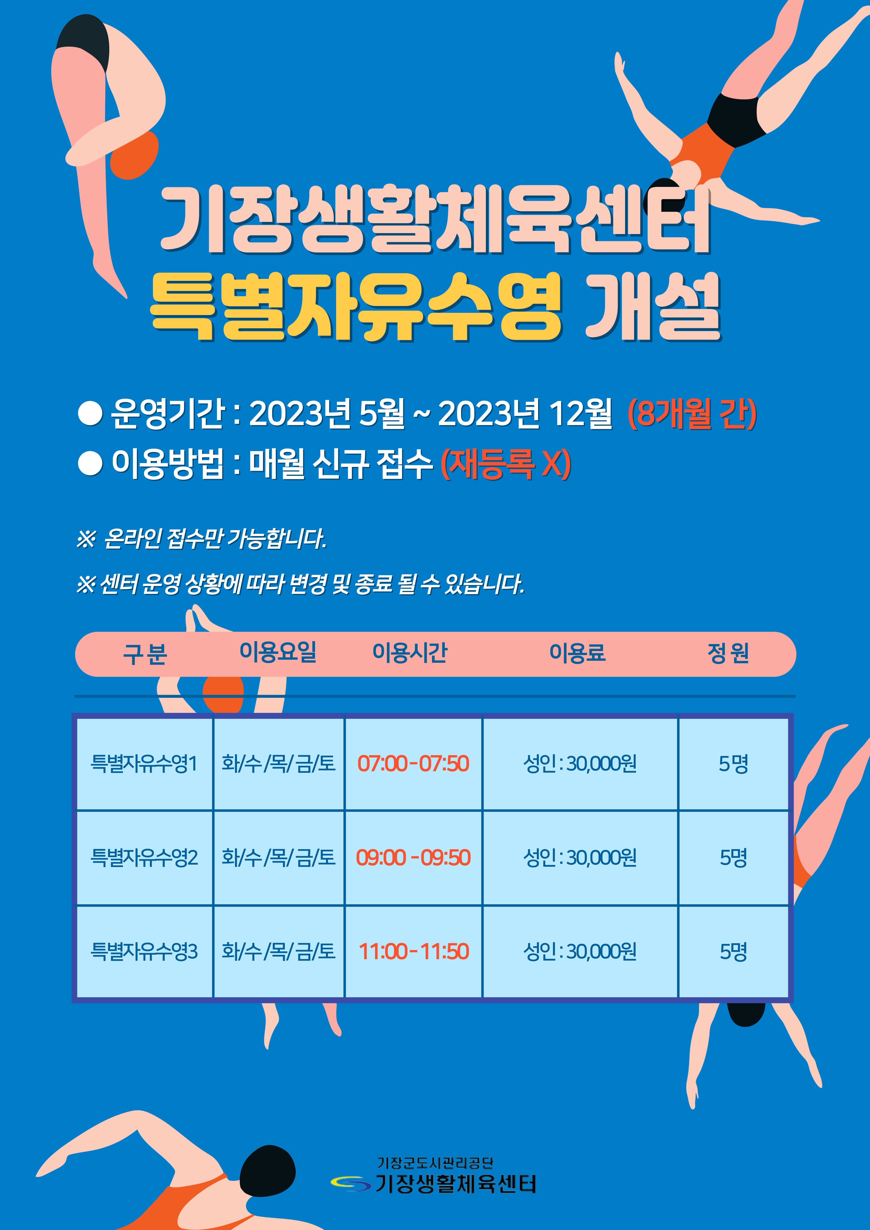 기장생활체육센터 특별자유수영 개설 안내 부서 - 등록일자 2023년 4월 25일 11시 33분 36초 조회 842 제목을-입력해주세요_-001 (2).jpg [ Size : 1.44MB , Down : 1,309 ] 미리보기 다운로드 목록보기