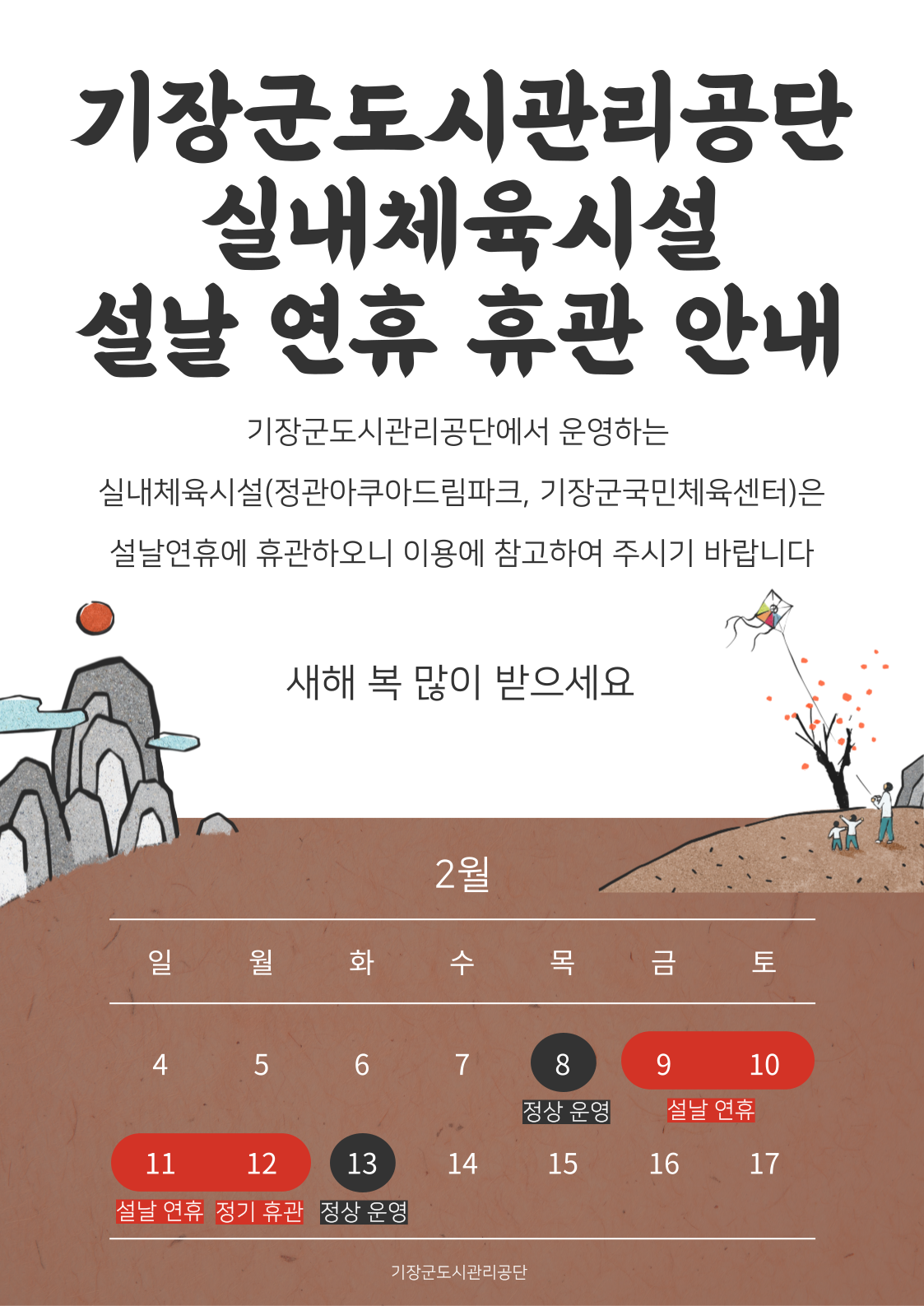 기장군도시관리공단 실내체육시설 설날 연휴 휴관 안내 부서 - 등록일자 2024년 1월 19일 19시 14분 16초 조회 411 기장군도시관리공단 실내체육시설 설날연휴휴관안내.png [ Size : 999.87KB , Down : 288 ] 미리보기 다운로드 목록보기