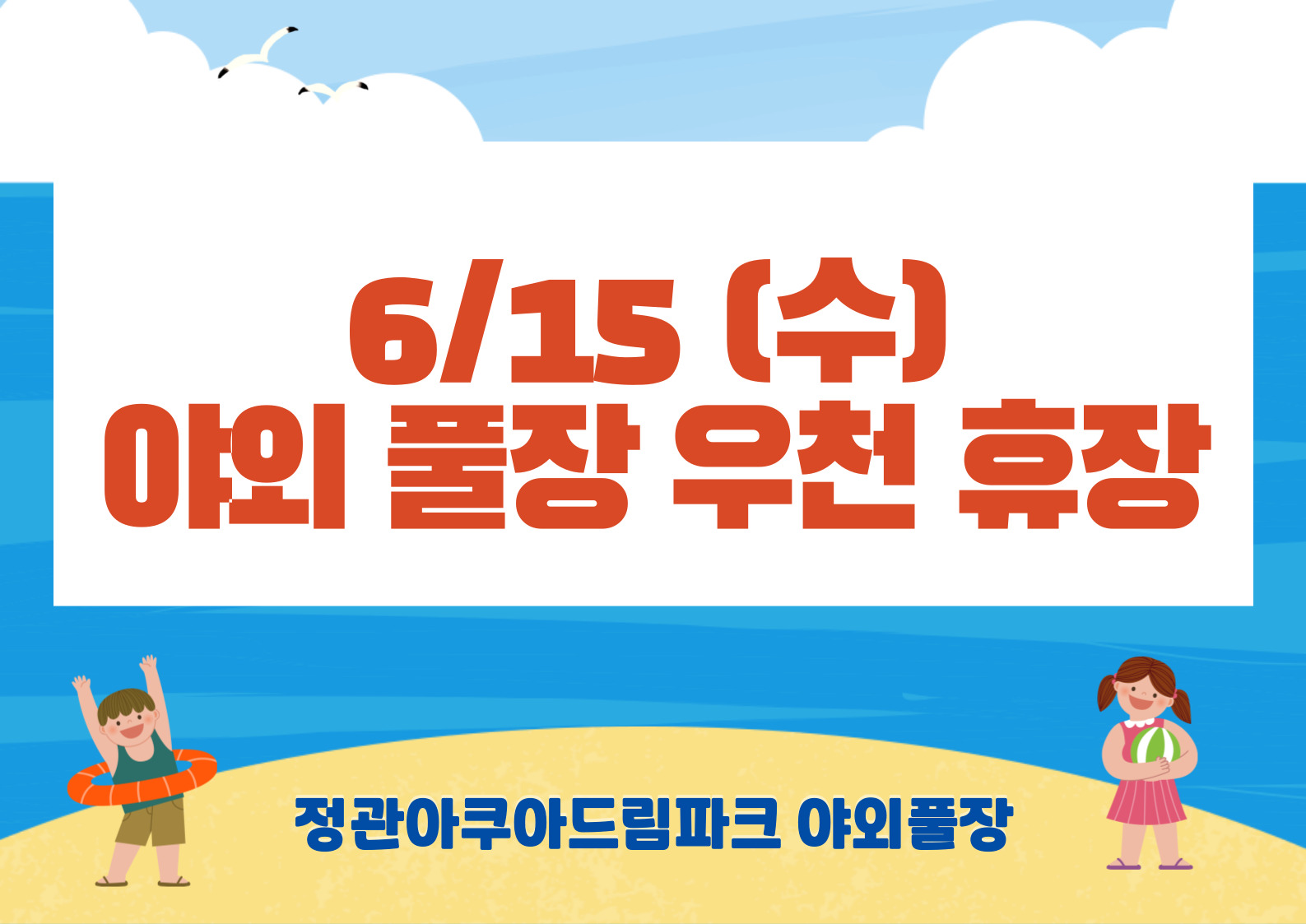 정관아쿠아드림파크 야외풀장 6/15(수) 우천휴장 공지 부서 - 등록일자 2022년 6월 14일 19시 32분 55초 조회 680 야외풀장 우천 예보로 휴장합니다. 0615우천휴장공지용.jpg [ Size : 225.16KB , Down : 199 ] 미리보기 다운로드 목록보기