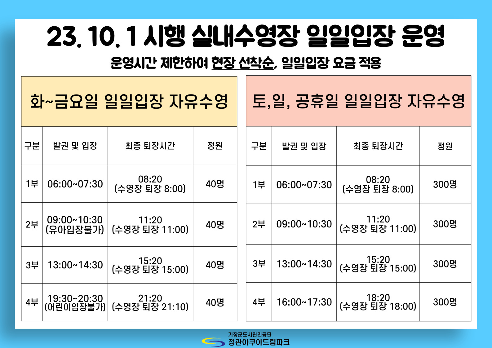 정관아쿠아드림파크 일일입장 자유수영 안내(2023.10.01 시행) 부서 - 등록일자 2023년 9월 8일 9시 43분 58초 조회 642 □ 화요일~금요일 1부 일일입장 07시 → 06시□ 화요일~금요일 2부, 3부 인원 50명 → 40명□ 발권 및 입장 시간 연장 감사합니다. 2023 10 일일입장 안내.jpg [ Size : 299.38KB , Down : 187 ] 미리보기 다운로드 목록보기