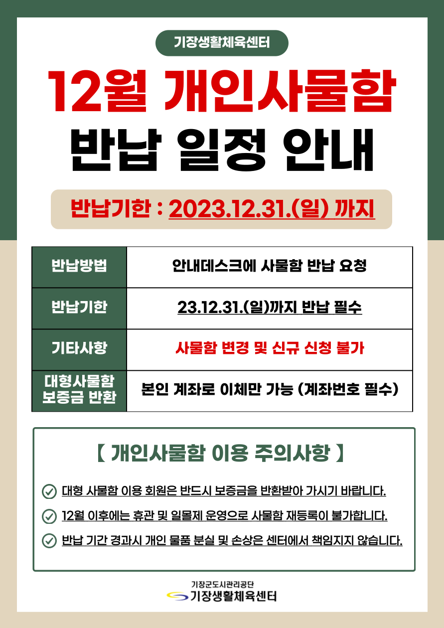 기장생활체육센터 12월 개인사물함 반납 일정 안내 부서 - 등록일자 2023년 11월 30일 10시 38분 31초 조회 378 12월 개인사물함 반납 일정 안내.png [ Size : 156.26KB , Down : 104 ] 미리보기 다운로드 목록보기