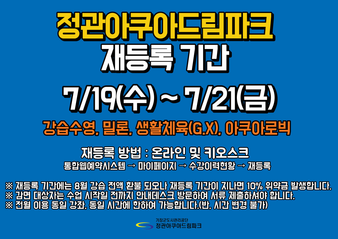 정관아쿠아드림파크 8월 강습 재등록 안내 부서 - 등록일자 2023년 7월 18일 15시 49분 53초 조회 600 재등록.jpg [ Size : 279.56KB , Down : 218 ] 미리보기 다운로드 목록보기