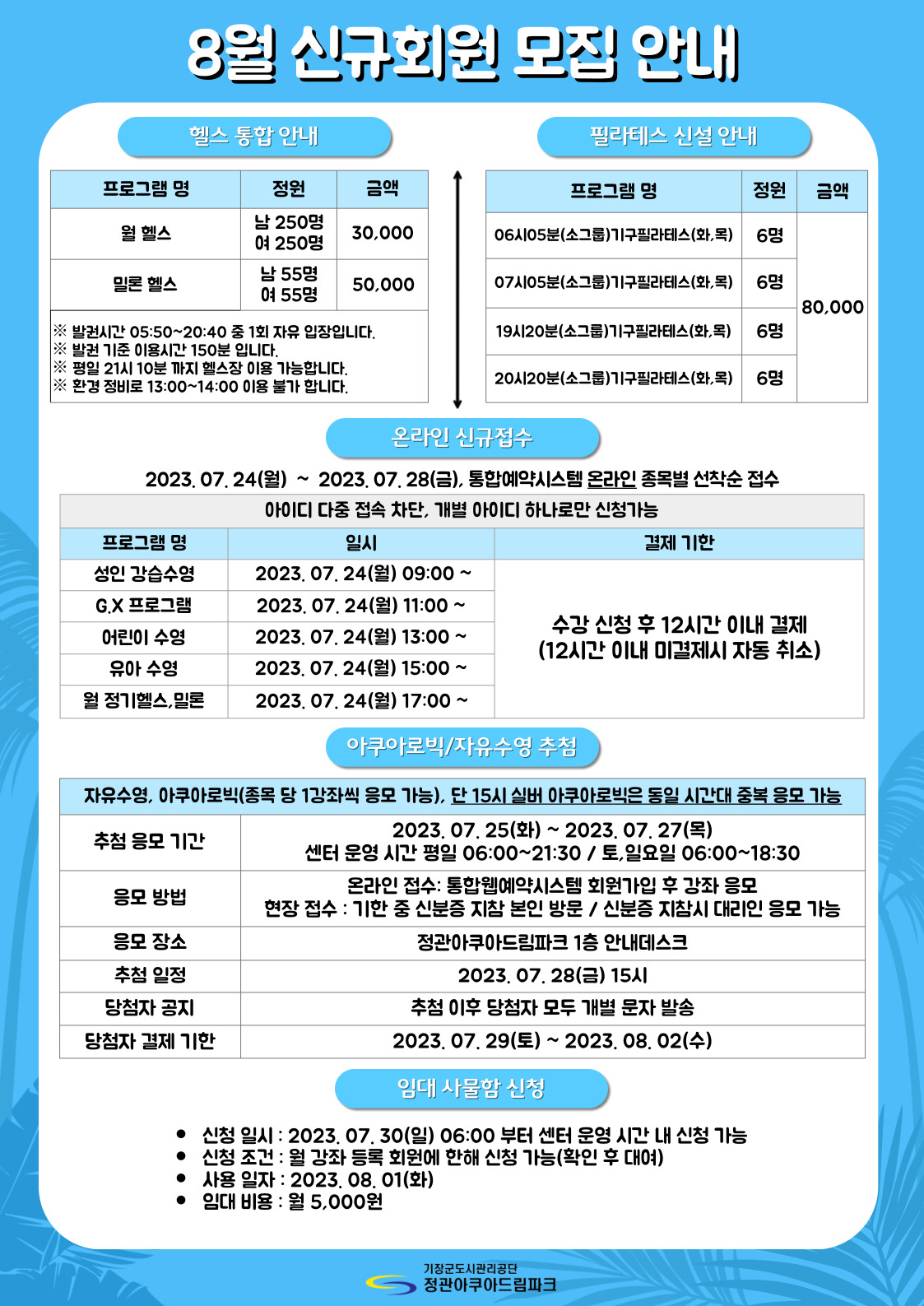 정관아쿠아드림파크 8월 신규등록 안내 부서 - 등록일자 2023년 7월 19일 17시 15분 22초 조회 960 ※ 8월 강습에 대한 신규 잔여 인원은 재등록이 끝난 후 7월 22일(토) 오후 14시 이후 공지 예정입니다. 8월 신규회원 모집안내.jpg [ Size : 439.31KB , Down : 415 ] 미리보기 다운로드 목록보기